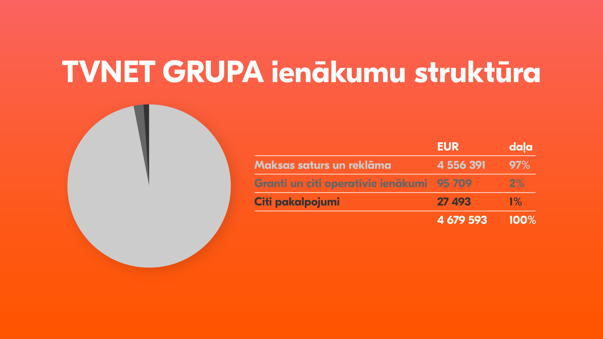 Mūsu ieņēmumu struktūru pamatā veido ienākumi no reklāmas izvietošanas un maksas satura abonementu pārdošanas. Papildu ieņēmumus veido satura un digitalizācijas projekti, kā arī citi ienākumi. Pilna izziņa par uzņēmumu pieejama Firmas.lv